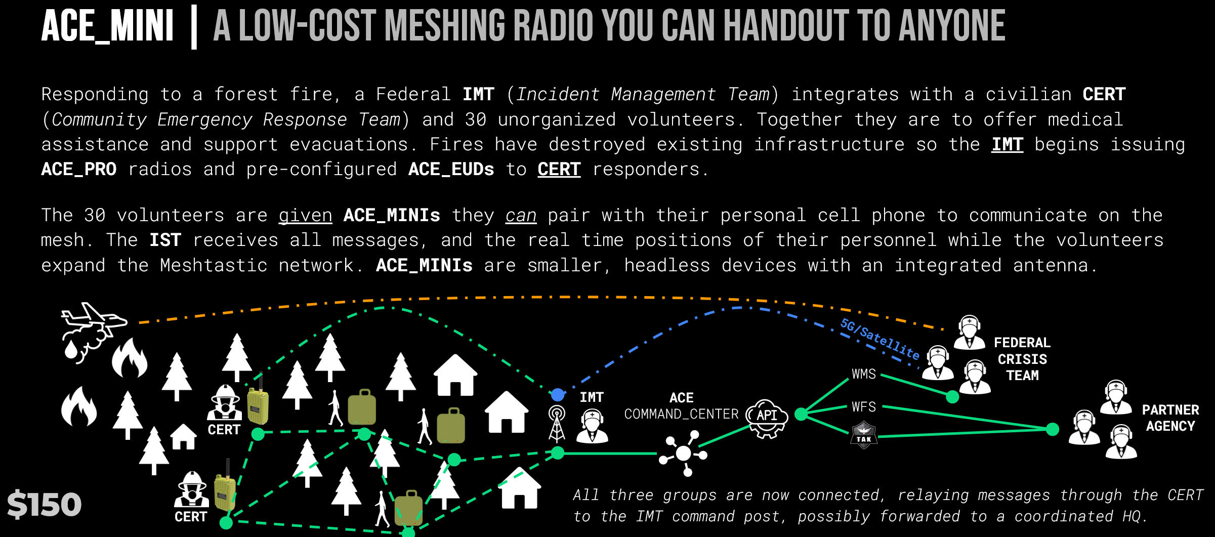 When infrastructure is out of reach or fails, traditional communications collapse. Teams lose coordination precisely when they need it most.ACE is a battery-efficient, meshing radio system that works without infrastructure. Text messages and GPS positions relay peer-to-peer across extended ranges. No towers. No subscriptions. No internet required.Ruggedized for emergency services, government operations, industrial sites, and remote environments. Ready to deploy in minutes.DevicesACE_MINI $150