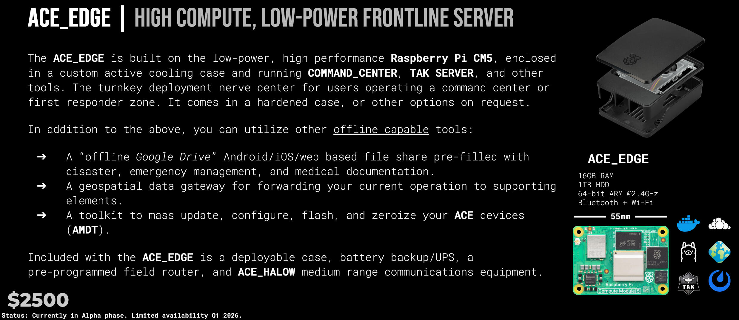 ACE_EDGE is a custom tuned field portable server to run offline, team oriented applications.