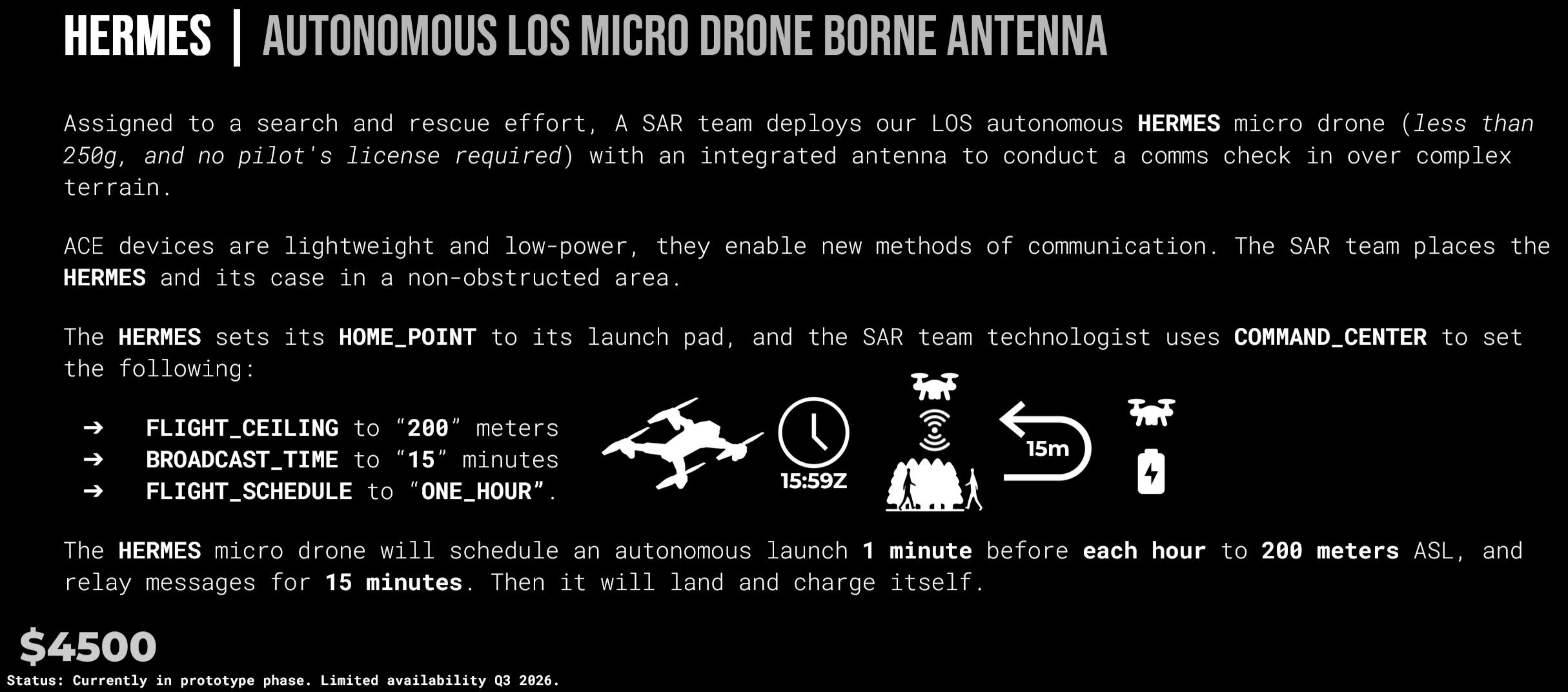 ACE_HERMES is a small, autonomous drone meant to bridge your mesh over a wide area, supporting check-ins and emergency support operations.