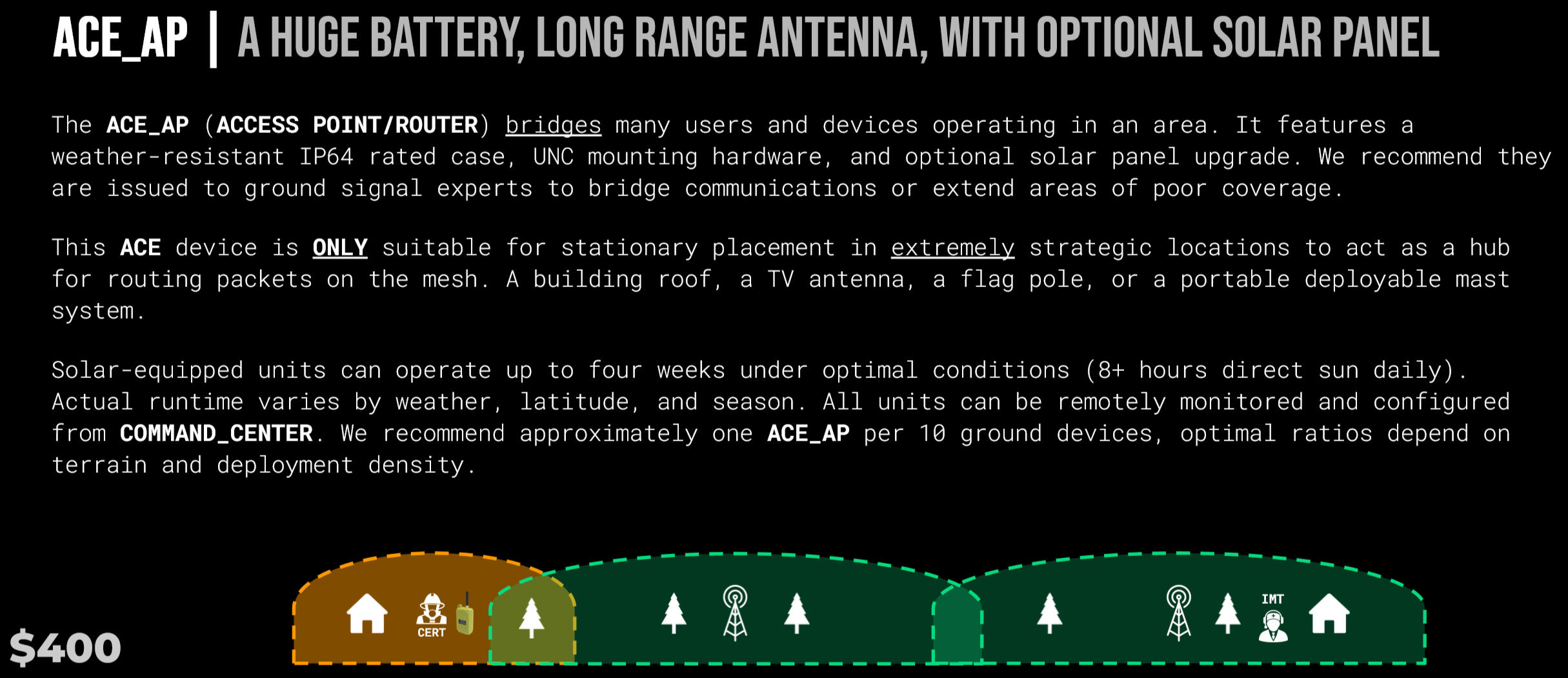 Field access point that bridges mesh networks to WiFi devices. Runs for weeks on a single charge.ACE_EDGE $2500